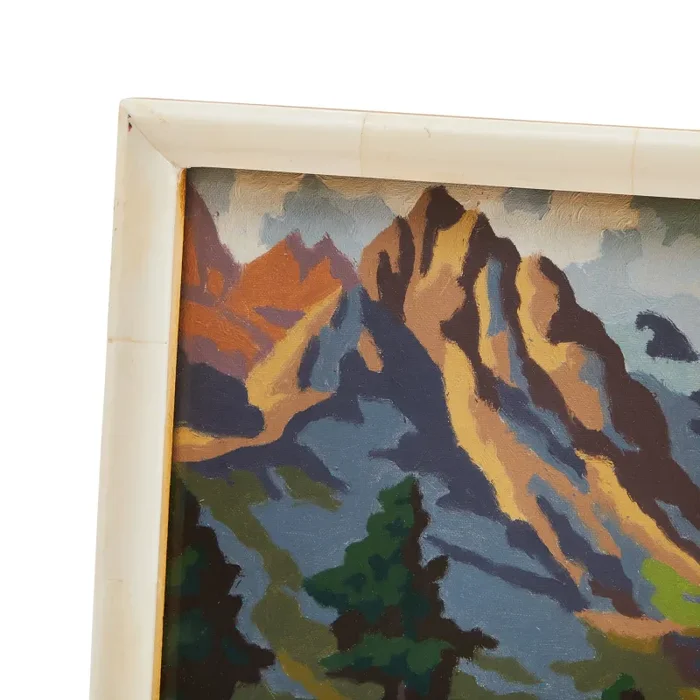 Details: Paint-by-numbers artwork of a rocky mountain with three pine trees in the foreground