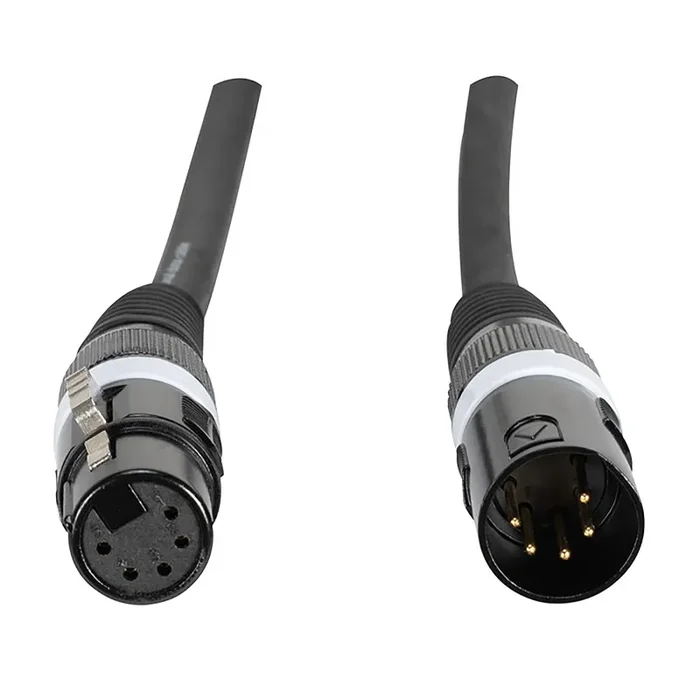 The 50-foot DMX Cable – 5-pin male to 5-pin female connection, No memory rugged cable: 22 AWG stranded (0.15 x 19) tinned copper conductors, polyethylene insulation, twisted pair, polyethylene inner jacket, Duofoil (100% coverage) and cotton plus a tinned copper braid shield (85% coverage), PVC jacket to prevent from kinking.