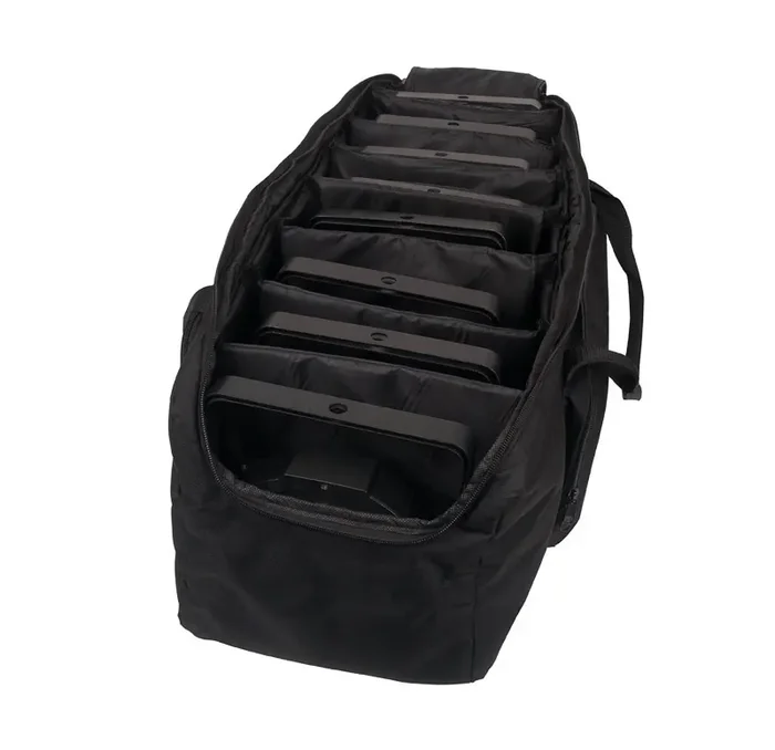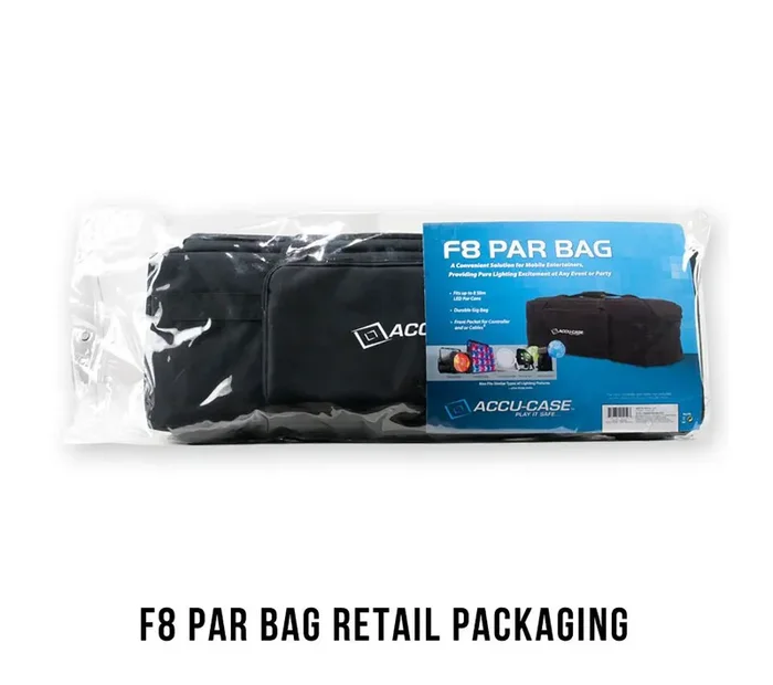 The Accu-Case F8 PAR BAG is a soft padded flat par transport bag that can store and protect up to 8 slim LED par lights and accessories. This soft padded bag features 7 padded dividers for organizing your gear, and an exterior, front pocket for accessories such as cables and/or controllers. Carry your bag with the twin, top, strap handles that connect with touch-fastening fabric. Your F8 Par Bag opens and closes with the two zipper pulls, and folds flat when empty for easier transport.