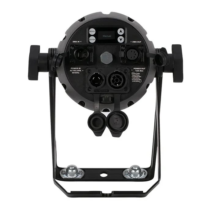 The Encore Burst RGBW IP has selectable dim modes, strobe effects, 4-button LED menu system, 5-pin DMX In/Out plus IP65 power locking In/Out connections to daisy chain data and power (rubber protective covers over connections).