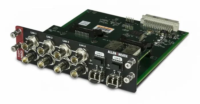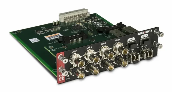 The Allen & Heath M-DL-SMADI2-A, 4 MADI links via BNC and SFP, 128 x 128 96k MADI is one of a portfolio of audio networking options that can be fitted to any Allen & Heath dLive or Avantis I/O port. Designed to help integrate dLive and Avantis into a wide range of broadcast, live interface and recording scenarios, the superMADI interface card has numerous connectivity possibilities, including 8 BNC connectors and 4 SFP slots for fibre optic transceivers (not included). Both coaxial and optical formats offer up to 128 I/O at 96kHz each, and redundancy and sample rate are switchable per link pair, with a choice of Smux or HighSpeed 96kHz mode. The superMADI card can also be used by engineers and rental companies to link to any MADI-enabled third party console, allowing high-channel count digital splits, for example, between FOH and Monitors.