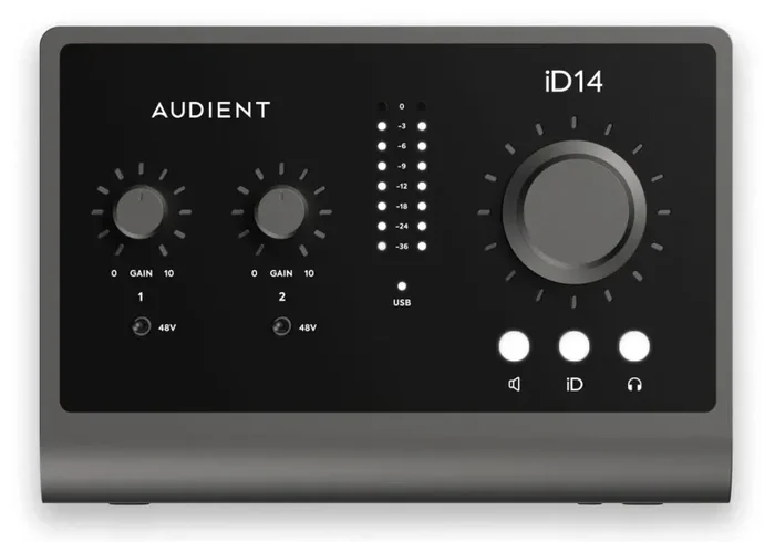 The Audient iD14 MKII USB-C Audio Interface Designed to take your recordings to the next level in every way, the iD14 (MKII) delivers professional audio performance in a compact and modern desktop package, giving you everything you need to make studio quality recordings at home.