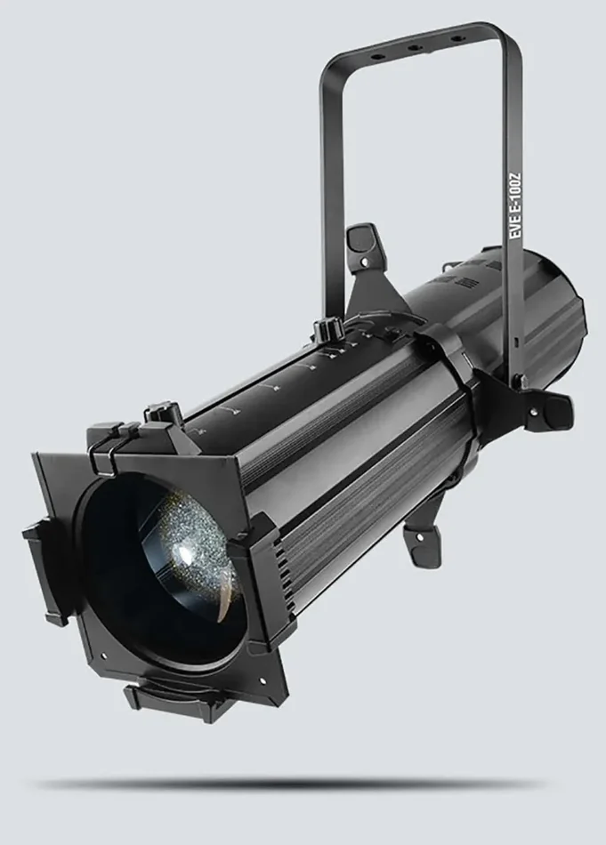 EVE E-100Z is a powerful spot fixture featuring sharp pattern projection with a 100 W warm white LED light source. It’s designed for mobile and installation applications. This versatile fixture works with metal or glass gobos to create incredible gobo or pattern details. The manual zoom and framing shutters make it simple to control beams.