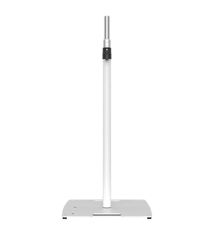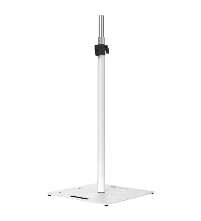 The Chauvet DJ FLEXSTANDWHT Sturdy, flexible stands are the backbone of your equipment. FLEXstand is the stand that defines strength, durability and flexibility. FLEXstand is a multi-purpose, telescoping stand that safely supports both lighting and audio gear. No more struggling with clamps that don’t fit stands because FLEXstand has different pole diameters to accommodate various clamps. FLEXstand is perfect for speakers too as the pole tapers into a speaker mount on top. A trigger-style safety release allows the pole to descend safely and set-up and tear down is easy without the need for any tools. The threaded pole can be inserted into multiple positions for different applications and a cast iron base includes rubber feet that won’t scratch delicate floors and allows for quick retrieval.