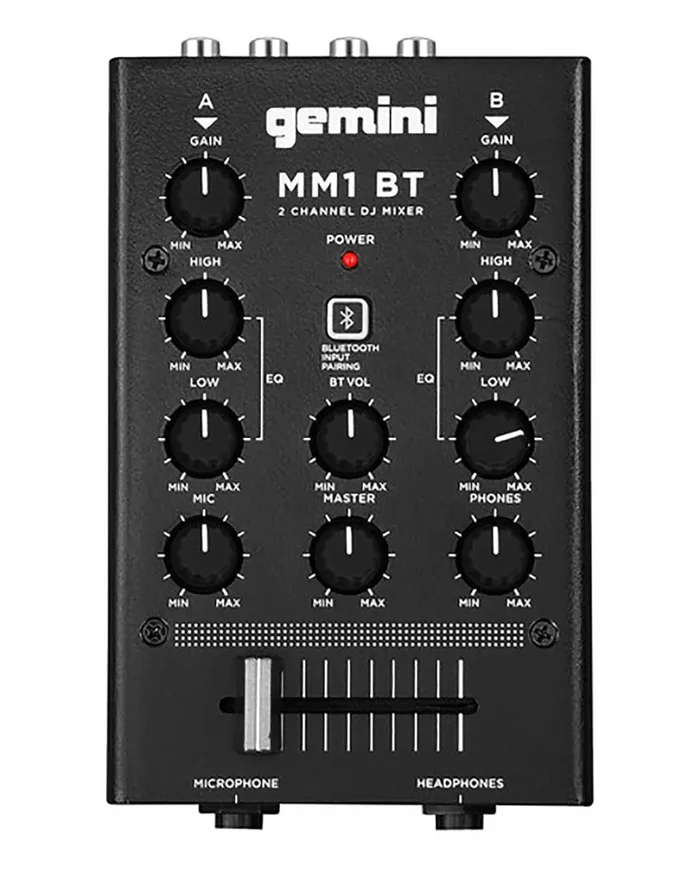 The Gemini Sound MM1BT, 2-channel compact mixer with bluetooth connectivity for wireless audio streaming from your favorite portable device. The mixer features gain control and a 2-band EQ on each channel plus a high-quality crossfader for blending tracks. The rear panel features stereo RCA inputs for channels A and B, as well as two stereo RCA outputs for master and record. The front panel features a 1/4″ headphone output and a 1/4″ microphone inputs. There are dedicated level control knobs for the headphone, microphone, Bluetooth, and master.