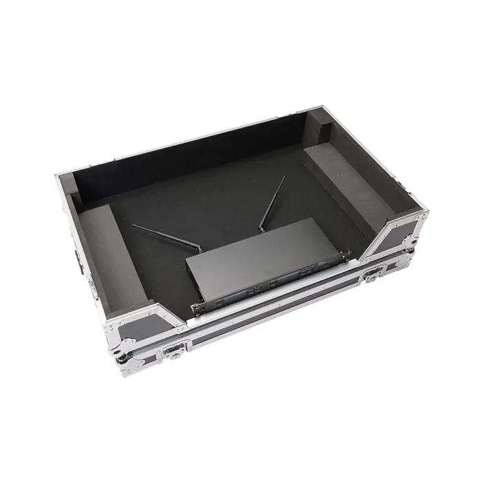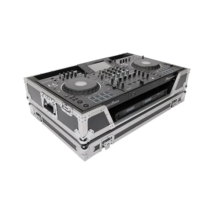 Customized to hold the Pioneer XDJ-XZ Controller and a 19 inches rack mount device 1U such as a wireless microphone system, power strip or storage drawer. Crafted from 9 mm vinyl laminated plywood, sturdy aluminum profiles, heavy duty butterfly latches and smooth rolling wheels, this case provides ultimate protection for mobile use on the road. The included 19” rack mounting brackets allow individually fastening of a 1U 19 inches unit or smaller devices at the front underneath the controller.