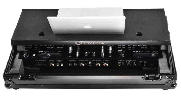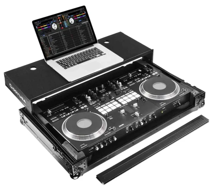 The Odyssey FZGSDDJREV7WBL is a Glide Style Flight Case for Pioneer DDJ-REV7 Controller with Wheels and Laptop Platform – Black – Black. All Case Constructs with Black Anodized and Powder Coated Hardware furthermore gears are not included, this is only the case.