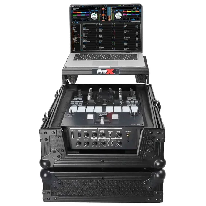 The ProX XS-DJMS11LTBL, Flight Case for Pioneer DJM-S11 Mixer with Sliding Laptop Shelf in Black on Black. The ProX XS-DJMS11LTBL ATA Style Flight Case designed for the Pioneer DJM-S11 and is made with the highest quality material and workmanship to give you the ultimate security for your Pioneer DJM-S11 Mixer. If you have a passion for your gear and want to keep it safe at all times, this case will perform at the highest level every time. The XS-DJMS11LTBL with sliding laptop shelf is constructed with our rugged signature 3/8″ Gig-Ready Series Plywood, reinforced steel ball corners for protection and easy stacking, and recessed steel padded handles and latches to protect them from damage during transport. There is additional space for cables and small accessories in the back and underneath the unit for convenience, as well as a removable front panel for you to access front input jacks easily. The front removable panel allows for easy access to the front controls and headphone/mic jacks.