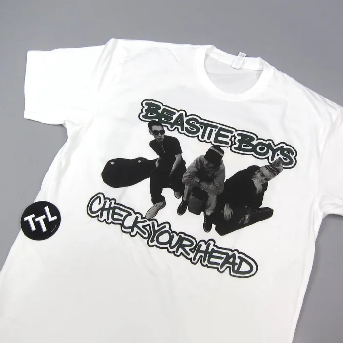 Merch for Beastie Boys’ third album, Check Your Head. The iconic album art graces the front, but the real treat is on the back of the shirt, as a Todd James (also responsible for the Brooklyn Dust Elephant logo as well as designs for Mobb Deep, Red Man, & more) aka REAS-designed graphic comically spells out the NY trio’s name. 100% cotton, double-needle sleeve and bottom hems.