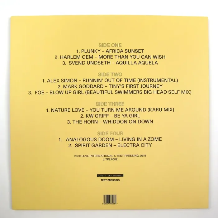 Ahhh, yes. DC’s Beautiful Swimmers (Future Times boss Max D and World Building jefe Ari Goldman) hand-picked these eleven tried-and-true club joints for this second entry in the Love International Fest comp series, run by the folks behind testpressing dot org, with tracks ranging from $100 wall record to dollar bin deepness, plus a few exclusive edits and first time on vinyl specials. The selection represents the duo’s wordly approach to digging and DJing, casting a wide berth that encompasses deep UK techno treats (The Horn’s “Whiddon On Down,” Spirit Garden’s “Electra City”), balearic ambient fusion (Plunky’s “African Sunset,” Svend Undseth’s “Aquilla Aquela”) and hyper-localized B-more club killers from KW Griff and Diamond K associate Foe. There’s something for any dance music lover to latch onto somewhere in this tracklist, from the heavenly Karu deep house mix of Nature Love’s “You Turn Me Around” to Legowelt-grade melodic techno stunner “Living In A Zone” by Analogous Doom (shoutout Missouri!) or private press DC boogie weirdness “Running Out Of Time” by Alex Simon. KW Griff’s utterly perfect flip of Teedra Moses’ “Be Your Girl” (Ahmad Jamal sample!) is Baltimore Club at its most sensual and sublime; pick it up just for this one, people. Everyone in the office already got their grubby mits on a copy so don’t get left in the dust. Recommended!