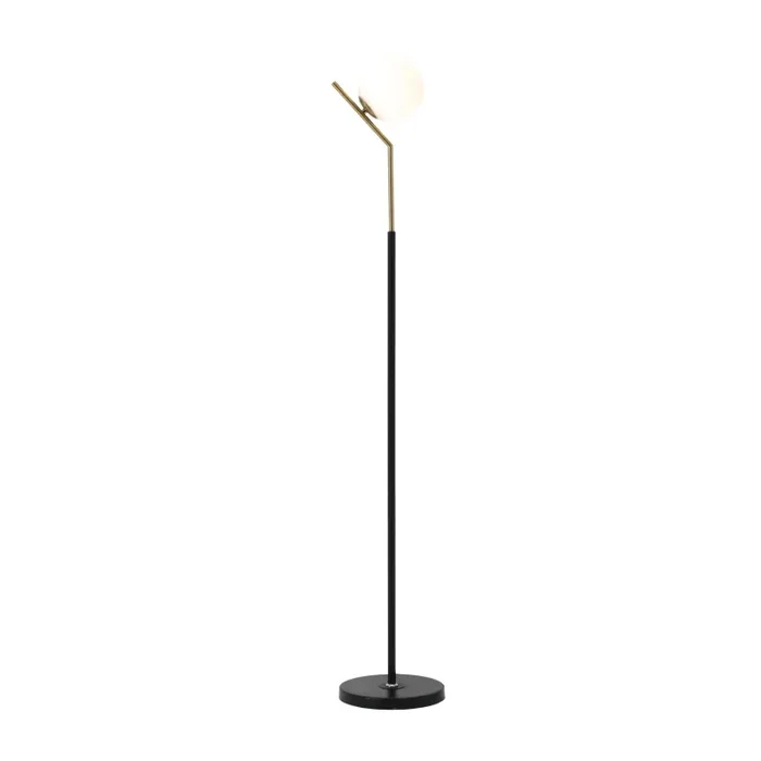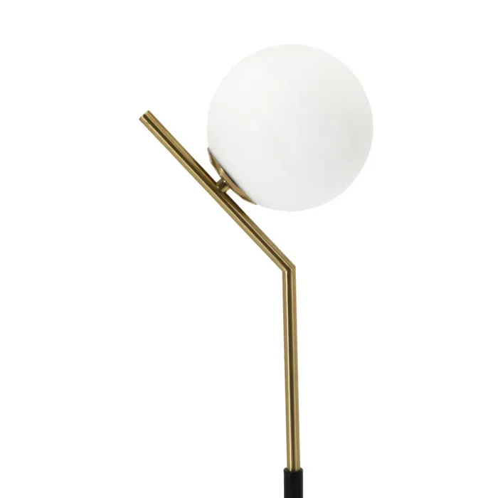 Details: Metal lamp with angled brass fixture and a singular orb.