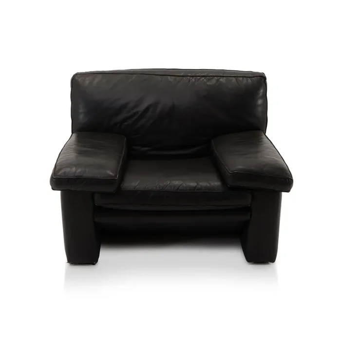 Details: Black leather armchair with wide armrests, part of a matching set