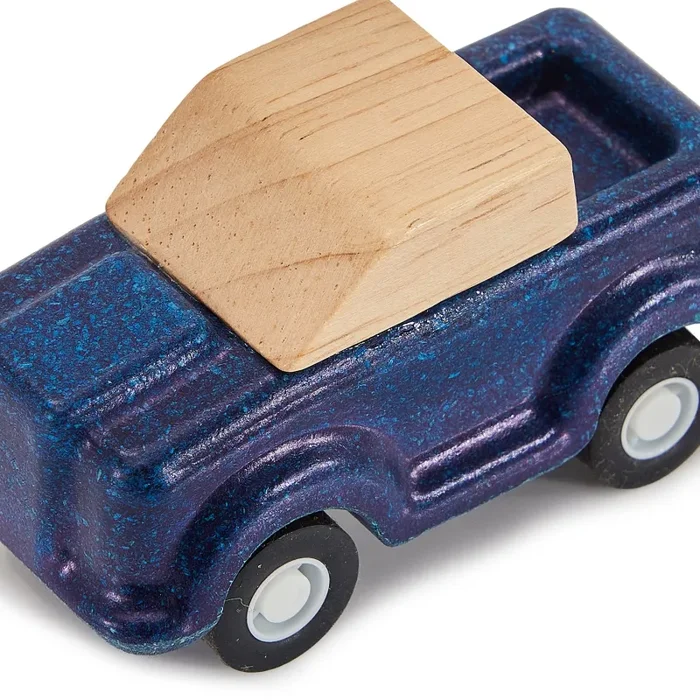 Details: Small blue toy pickup truck with a wooden top, a blue body, and black plastic wheels, available as a set with four other toy automobiles