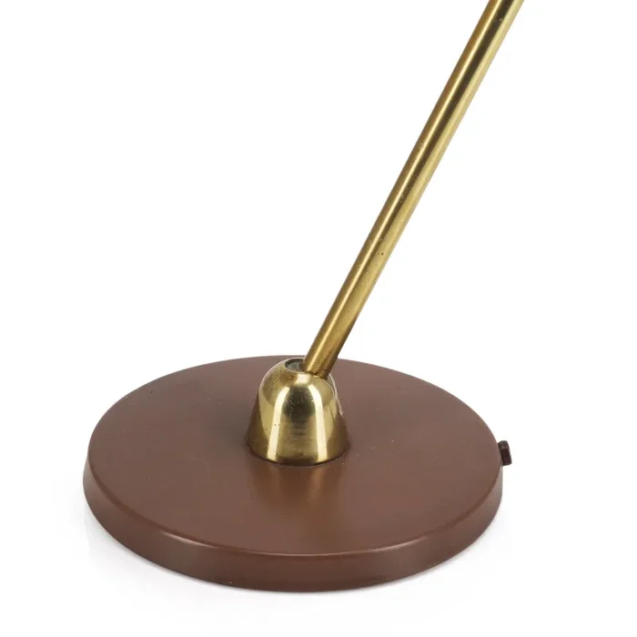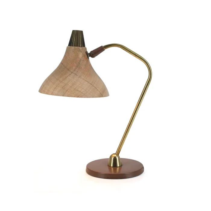 Details: Brass desk lamp with brown base and woven fiber shade