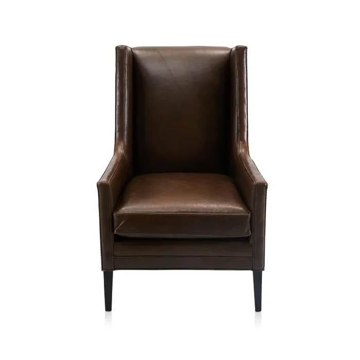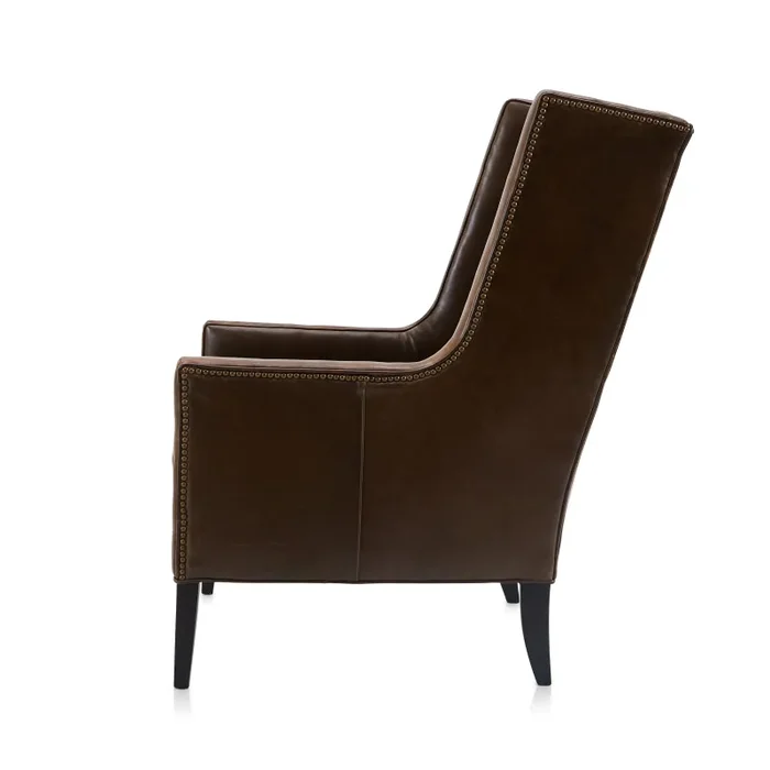 Details: Brown leather reclined wingback armchair with brass nailheads and dark wood legs