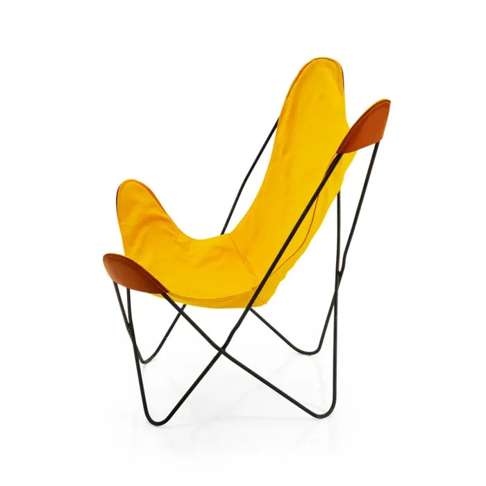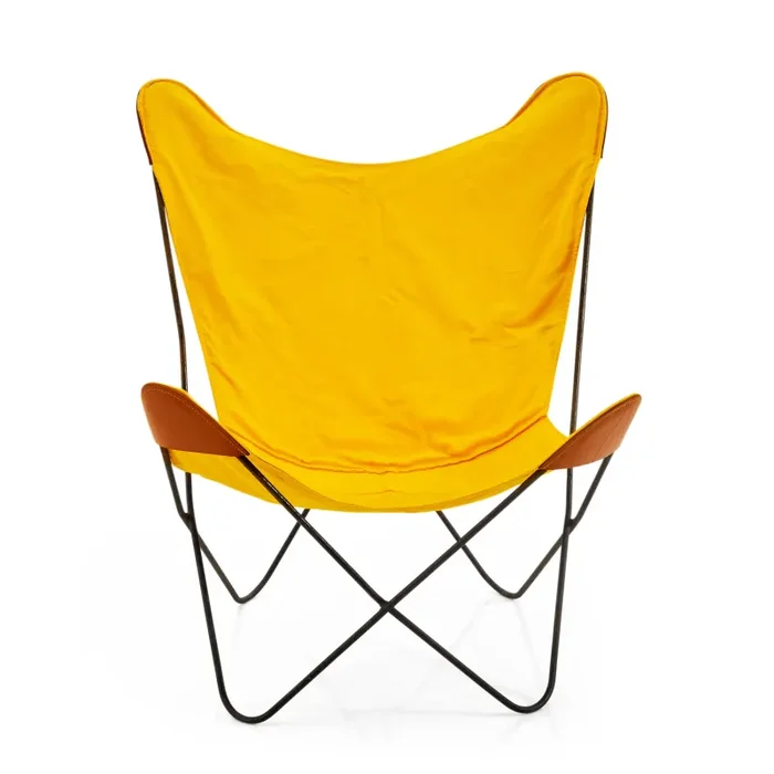 Details: Blue canvas sling Butterfly chair with black metal frame and leather corners
