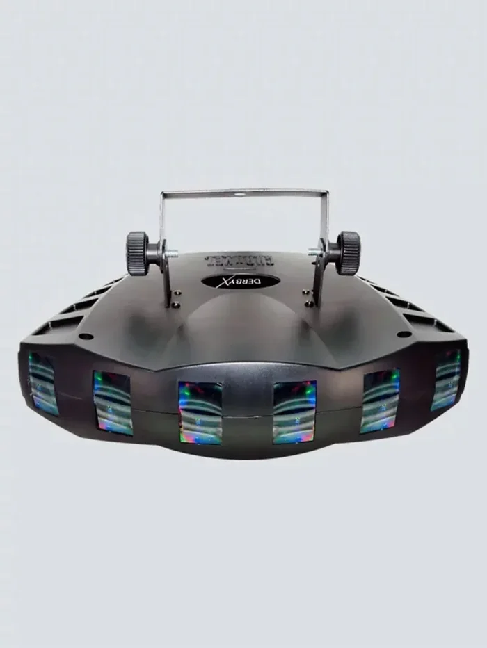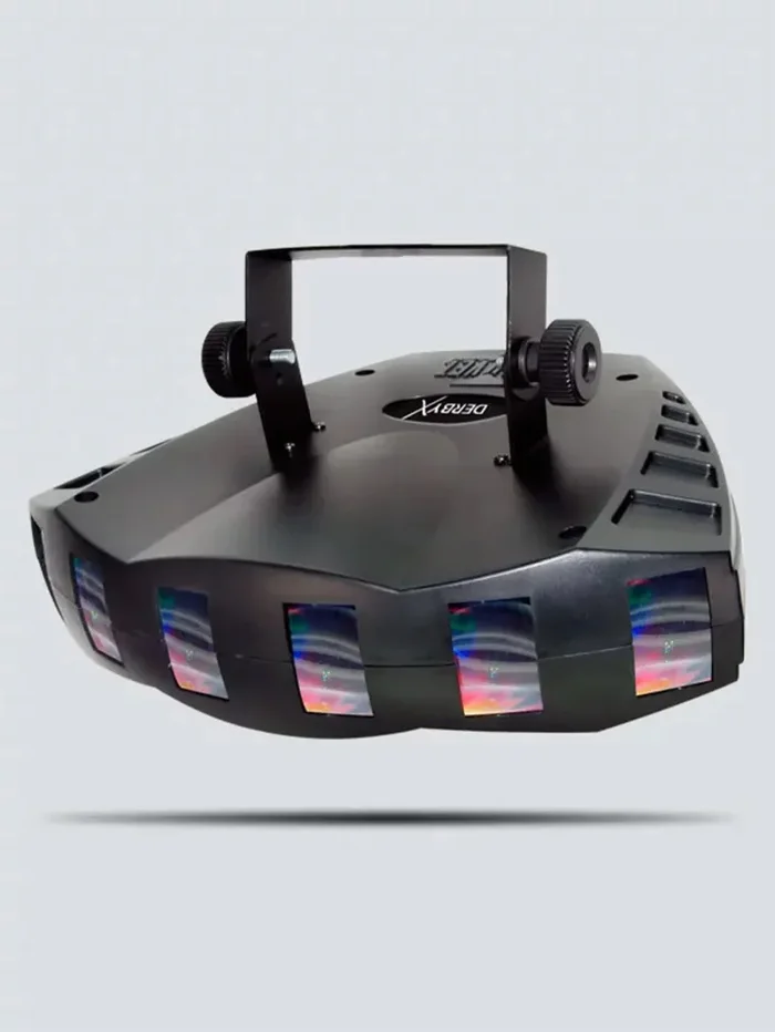 The Derby X is a DMX-512 LED derby effect light, featuring individual control of all 6 LED clusters. Additional features include blackout/static/strobe, built-in automated and sound activated programs, and linkable power for up to 27 units.