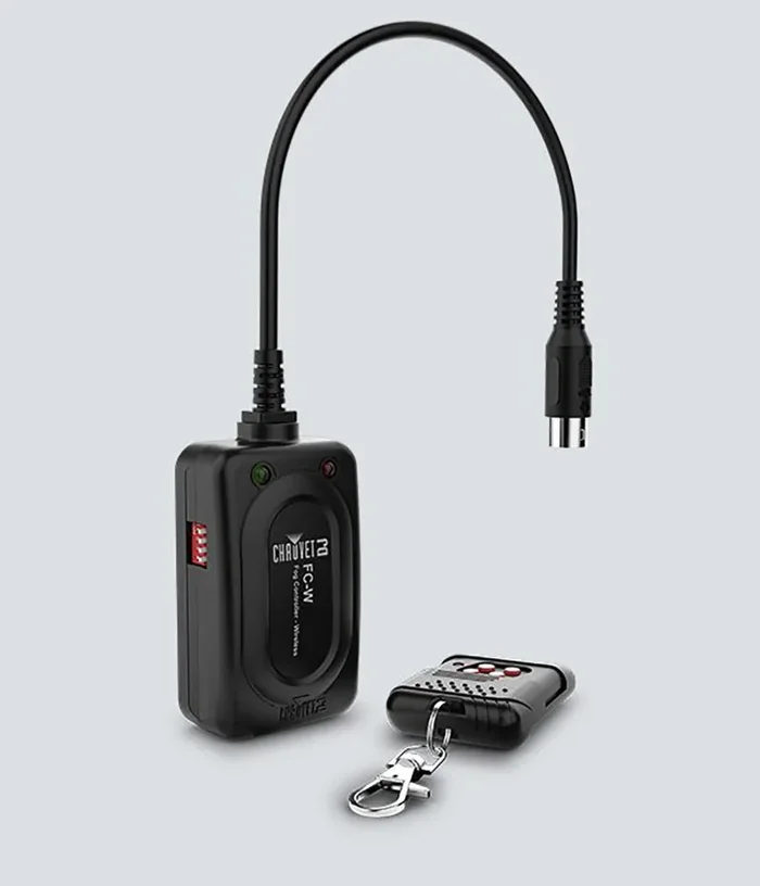 The CHAUVET DJ FC-W Wireless Remote Controller is the perfect accessory for effortlessly controlling your CHAUVET fog machine from a distance. This set includes a transmitter and a receiver that operate at the 433 MHz frequency, enabling seamless wireless operation. Simply connect the receiver to the labeled 5-pin “Wireless Controller” port on your fog machine, set the desired channel, and you’re ready to go.