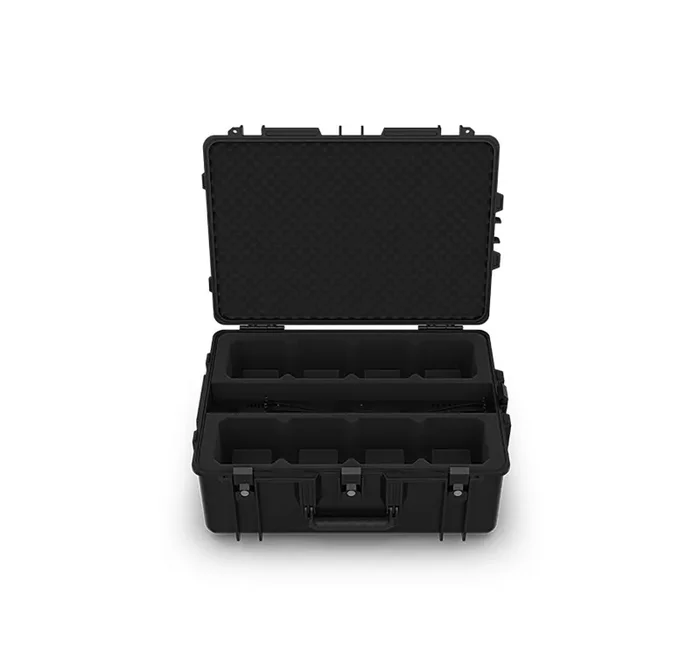 The Pelican-style transport case charges up to 8 Freedom Par fixtures simultaneously. High strength polypropylene material is water-resistant and resistant to damage. Custom molded interior ensures a damage-free transportation experience. Fixed cable leads plug directly into fixtures without needing individual power cords. Rugged wheels and telescoping handle make transportation stress-free. Multiple child-resistant latches with ability to add pad locks reduce unwanted intrusions.