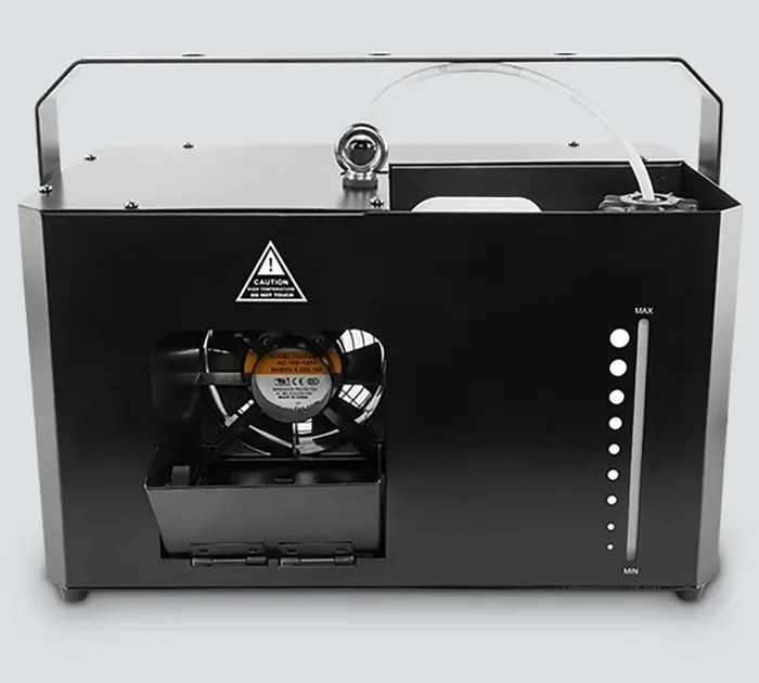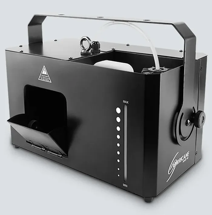 The Chauvet DJ Hurricane Haze 4D is a low profile hazer with an adjustable scoop to direct the haze and a discreet fan. It can be controlled with the included wired timer remote and built-in DMX.