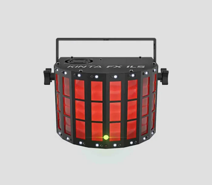 The Chauvet Kinta FX ILS RGBW Led Derby, Laser, Led, Strobe Multi-Effect. Hundreds of red and green laser beams. These are just a few of the effects that are sure to dazzle event guests from the Kinta FX ILS, a compact multi-effect light with a Kinta, laser, and SMD strobe. What makes this exciting effect light even more potent is its ILS compatibility with the cutting-edge Integrated Lighting System (ILS) that makes creating coordinated light shows across different fixture types easy. Kinta FX ILS also has D-Fi USB compatibility for wireless Master/Slave or DMX control. Easily control the unit from DMX, Master/Slave, IRC-6, or the digital display.