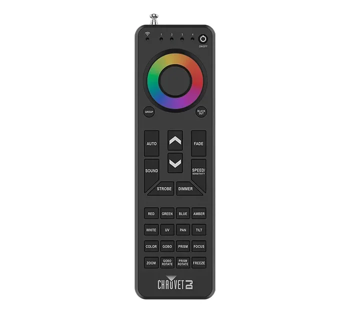 The Chauvet DJ RFC-XL Handheld Remote Control for RF-Enabled Lighting Fixtures. Rubberized and backlit buttons ensure they are accessible in dark environments. Controls up to 4 different fixture groups simultaneously. Works with different fixture types such as washes and moving heads. RF signal is omnidirectional and doesn’t require line-of-sight. Telescopic antenna ensures the signal reaches its destination.