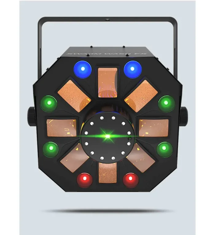 The Chauvet DJ Swarm Wash FX is a 4-in-1 LED effect fixture that combines an RGBAW rotating derby, RGB+UV wash, red-green laser, and a ring of white SMD strobes. Create an endless array of looks by individually controlling each effect via DMX and master-slave modes. Other features include automated and sound-activated programs and a user-friendly menu structure. Multiple units can be power linked to save time running cables and extension cords. Fits best in the CHS-40 VIP Gear Bag.