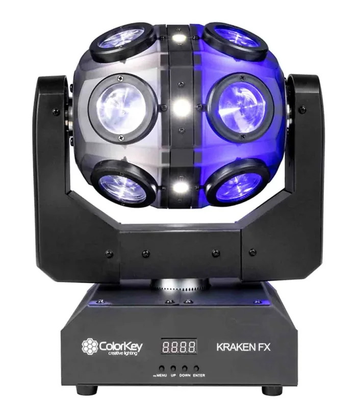 The Colorkey CKU-1070 is a Kraken FX Energizing Quad Color LED Effect Light with Built-in Blinder Perfect for Mobile DJs, Bars, and Clubs, the ColorKey Kraken FX creates energy with its frenzied movement and tentacle-like beams of light. Featuring (7) 10W Red, Green, Blue, and White LED’s positioned alongside a strobing LED strip, Kraken offers dizzying pan rotation and infinite tilt rotations allowing it to create a one-of-a-kind FX lighting experience. The 100% dimmable strobe also acts as a blinder when needed. Controlled with 512DMX, Sound Active or Auto Programs, Kraken works well as a centerpiece light. Like a mythical creature rising from the depths, Kraken bursts into action with a dazzling display of light and movement