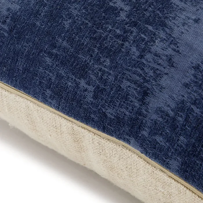 Details: Square pillow with blue front with rough velvet texture and tan back