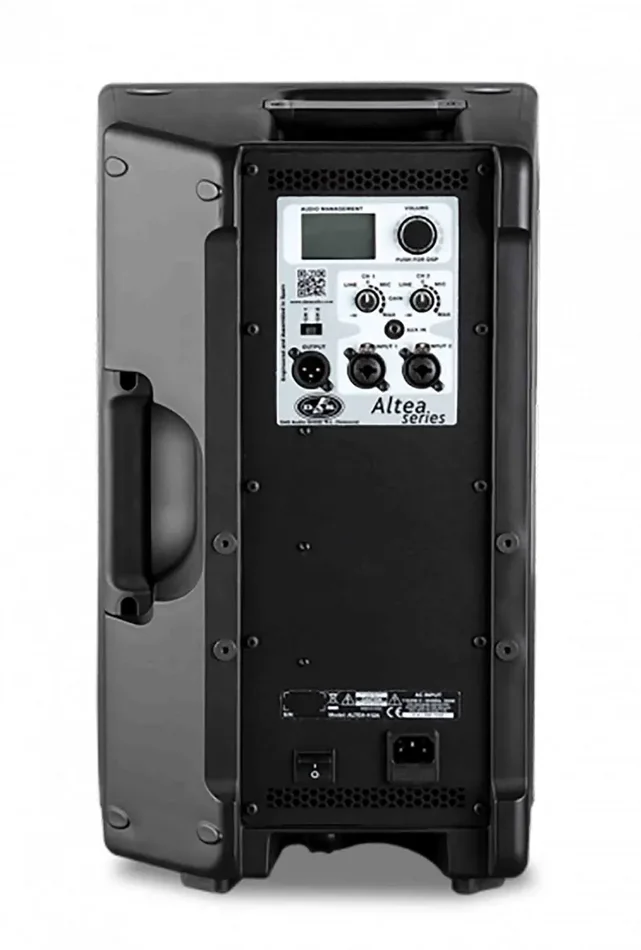 The ALTEA-408A is a powered portable P.A. system with a multi-angle polypropylene enclosure that allows for use as a stage monitor. On board is Class D two channel amplifier of exceptional quality providing a total of 800 W peak power which provides extended bandwidth, wide dynamic range and exceptionally low distortion-features hard to find on other systems in this market segment. User configurable voicing, filter and EQ modes, and gain control are achieved by way of a rotary-knob interface and LCD screen on the rear of the cabinet.