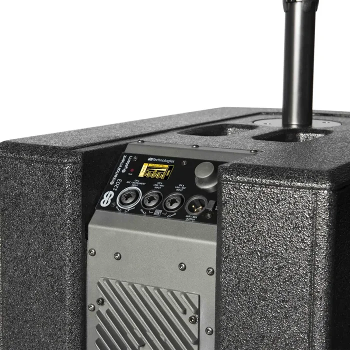 The dB Technologies ES1203 is a 3-amped stereo sound system composed by 2 passive wooden tops and one active wooden subwoofer equipped with 2X12” woofers. The sub hosts last-generation Digipro G4 2400W Peak amp. A powerful DSP (controlled by an intuitive user interface placed on the top of the sub) manages all function of the 5-channel on-board digital mixer as well as the system configuration. Each top satellite is equipped with 4×4” mid-woofers, whose alignment allows an asymmetrical vertical coverage (thanks to the Logarithmic Curved Column Array technology). The unique design of phase plugs widens the horizontal coverage and guarantees a perfect intelligibility. Moreover, on board DSP allows users to choose among 3 Configuration Modes (Mono, Stereo or Double Column) and 2 different Steering Modes (Far and Near). This way, the system adapts to all kind of environments and guarantees the best throw pattern. Top satellites work separately in a stereo configuration(placed on tripods or installed with WB-44 accessory) or connected together in mono configuration. The enclosure of both satellites embeds a metal lock system assuring perfect top to top matching and electrical connection. One of the two satellites receives the signal from the sub and relaunch it to the companion top. ES1203 features an on board 5-channel mixer: the first channel features a MIC/instrument balanced/unbalanced combo connector with an adjustable anti-feedback filter, impedance compensation and microphone gain with 3 positions (0, +10, + 20dB). The second and third channels are MIC/LINE inputs with balanced/unbalanced combo connector. This allows the system to manage up to 3 mic lines at a time.