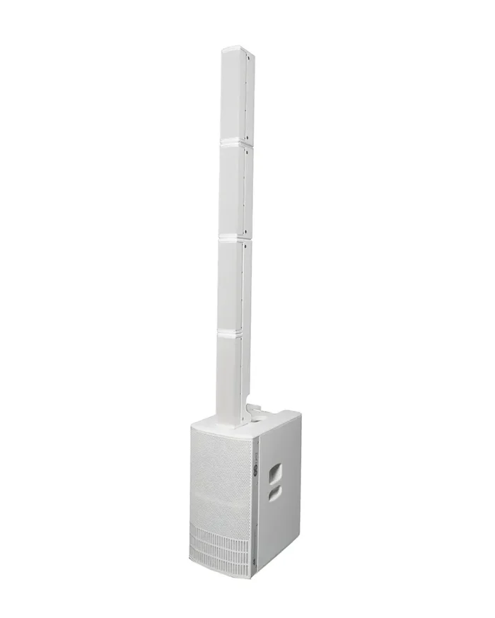The dB Technologies ES 1203 WHITE is a 3-amped stereo sound system composed by 2 passive wooden tops and one active wooden subwoofer equipped with 2X12” woofers. The sub hosts last-generation Digipro G4 2400W Peak amp. A powerful DSP (controlled by an intuitive user interface placed on the top of the sub) manages all function of the 5-channel on-board digital mixer as well as the system configuration. Each top satellite is equipped with 4×4” mid-woofers, whose alignment allows an asymmetrical vertical coverage (thanks to the Logarithmic Curved Column Array technology). The unique design of phase plugs widens the horizontal coverage and guarantees a perfect intelligibility. Moreover, on board DSP allows users to choose among 3 Configuration Modes (Mono, Stereo or Double Column) and 2 different Steering Modes (Far and Near). This way, the system adapts to all kind of environments and guarantees the best throw pattern. Top satellites work separately in a stereo configuration(placed on tripods or installed with WB-44 accessory) or connected together in mono configuration. The enclosure of both satellites embeds a metal lock system assuring perfect top to top matching and electrical connection. One of the two satellites receives the signal from the sub and relaunch it to the companion top. ES1203 features an on board 5-channel mixer: the first channel features a MIC/instrument balanced/unbalanced combo connector with an adjustable anti-feedback filter, impedance compensation and microphone gain with 3 positions (0, +10, + 20dB). The second and third channels are MIC/LINE inputs with balanced/unbalanced combo connector. This allows the system to manage up to 3 mic lines at a time.