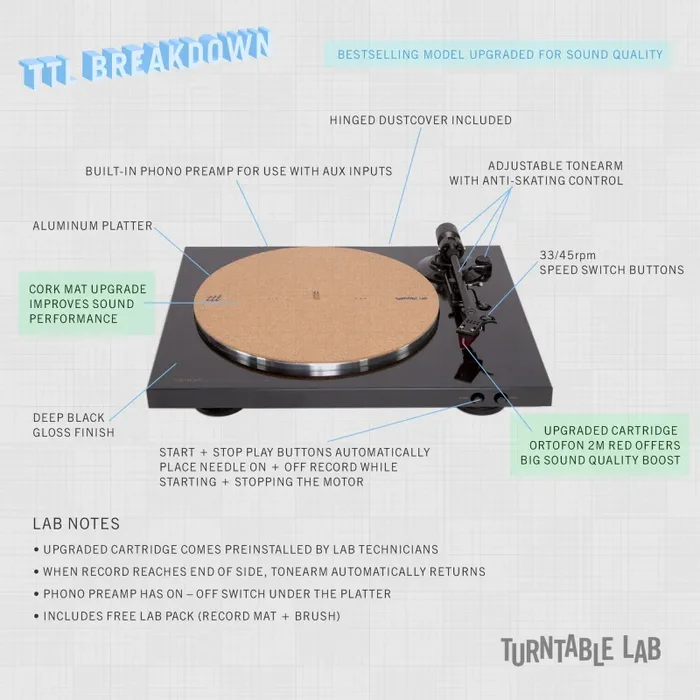 - this package also includes our Turntable Lab Cork Mat and Turntable Lab Carbon Fiber Brush