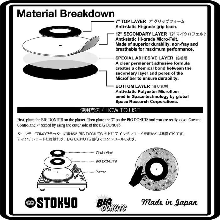 The Dr. Suzuki x Technics BIG DONUTS (DSS-BD02) is a combination pack designed to enhance DJ performance and record playback. This pack combines two Dr. Suzuki slipmats – a 12-inch version and a 7-inch version – designed specifically for use with Technics turntables. The slipmats feature a collaboration design between Dr. Suzuki, a well-known brand for DJ equipment accessories, and Technics, the iconic turntable manufacturer. Big donuts is a dedicated slip mat that enables stable cueing and performance djing on 7” records. The base is a 2 mm thick Dr. Suzuki slipmat (with anti-vibration and sliding properties) combined with a 7” ring made from special grip foam. We guarantee a smooth performance with finesse and style without touching the 7” record and controlling by using the 12” slipmat area.