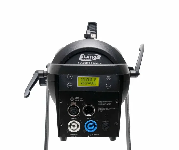 The Elation Colour 5, Profile Ellipsoidal features a 180W RGBAM (Red, Green, Blue, Amber, Mint) LED engine, >94CRI, 4,100 total lumens, with 19°, 26°, 36°, and 50° interchangeable lens options (sold separately), (4) blade manual framing shutters, manual focus, supports B size metal HT transparency gobos, DMX controlled electronic strobe, dimming, and dimming curves, flicker free operation for TV and FILM, adjustable refresh frequency and gamma brightness, 5pin DMX and Locking Power Cable in/out connections, (4) button LCD control display panel, an integrated rigging yoke, quiet fan cooling, and a multi-voltage universal auto switching power supply (100-240v).
