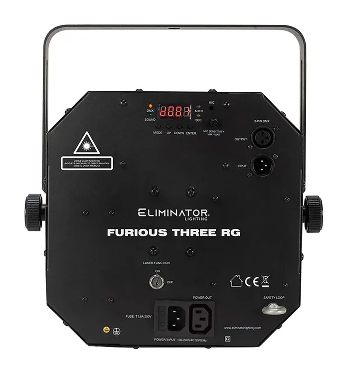 The Eliminator Lighting Furious Three RG, 3-FX-IN-1 Moonflower, Wash, and Laser Light Fixture utilizes three light sources – six 5W 5-penta LEDs, eight 3W quad LEDs and a red and green laser – to give users such Moonflower/Wash/Laser combo effects that create a high level of enjoyment for party guests.