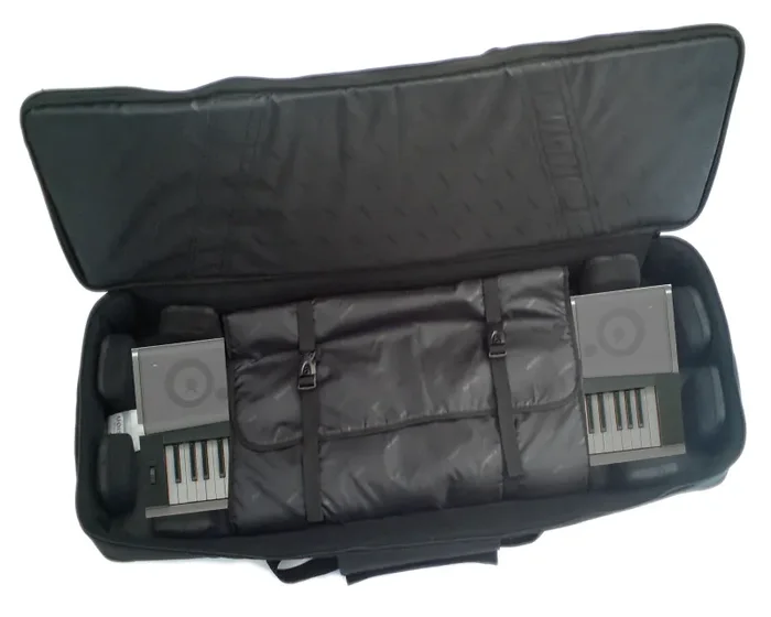 The Fusion Keyboard 12 gig bag is made of high quality, water-resistant polyester. The inside features a sleeve that can be tightened to secure a keyboard or synthesizer in place and a number of soft velvet-mix 2″ x 2″ padded blocks that provide a customizable snug fit.