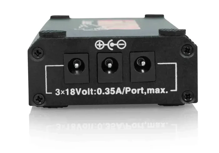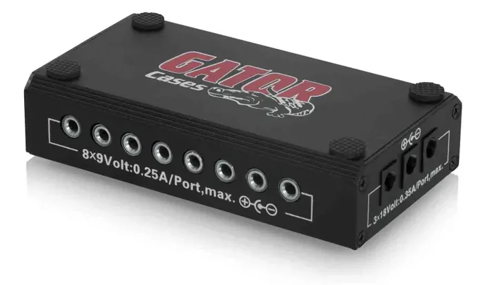 The Gator G-BUS-8-US Keep pedals powered safely and neatly with the multi-output DC source G-BUS-8-US pedal board power supply with short circuit protection. This 1700 milliamp unit features heavy-duty aluminum housing and enough juice to fuel up to 11 standard size stomp boxes. Pick your power through a variety of 9V and 18v multi-output options. Connect your stomp boxes securely with one 18v 24″ and eight 9V 24″ straight end cables. Four mounting holes can be used with any Gator or other brand pedal boards. Guitar effects pedals are fully powered with the G-BUS-8-US pedal board power supply from Gator Cases.