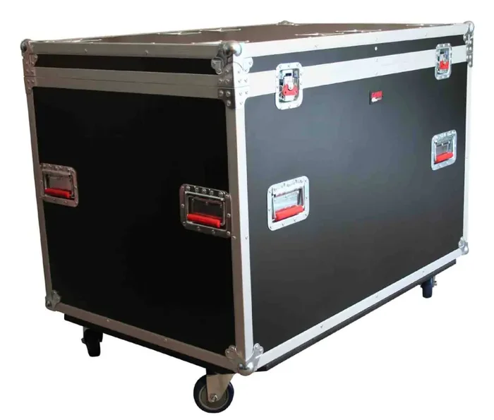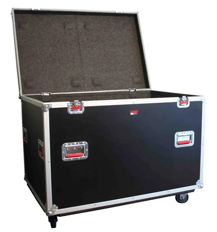 The Gator Case G-TOURTRK4530HS is 9mm Plywood Construction with Laminated Exterior. Red Recessed Twist Latches. Heavy-Duty Commercial Grade Plated Hardware and Reinforced Ball Corners. Truck Pack Trunk with Hinged Lid and Grey Carpet Interior. Recessed Dishes on Top of Case Allow Stackability. 4 Casters, 2 Locking.