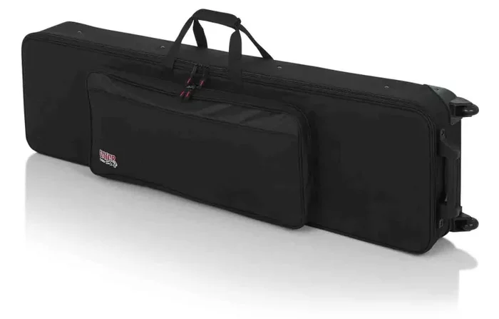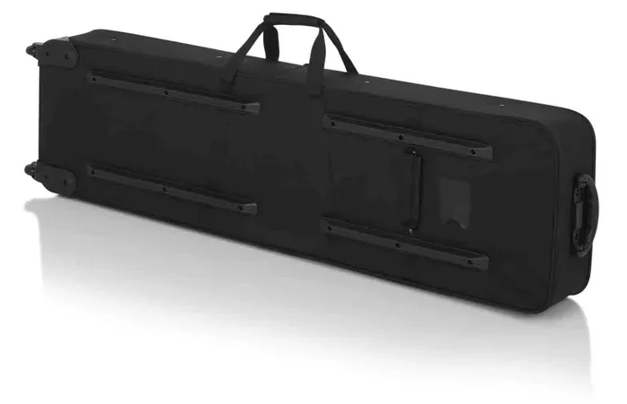 The Gator GK-76-SLIM Case has Large accessory compartments on the outside for pedals and cables. Fully Adjustable Padded Straps to Secure Keyboard in Place During Transport. Interior is Lined with Tricot and Soft Foam. Built-In Wheels with Tow Handle and Skid Bars. Rugged Nylon Construction with Polyethylene Reinforced Interior Frame.