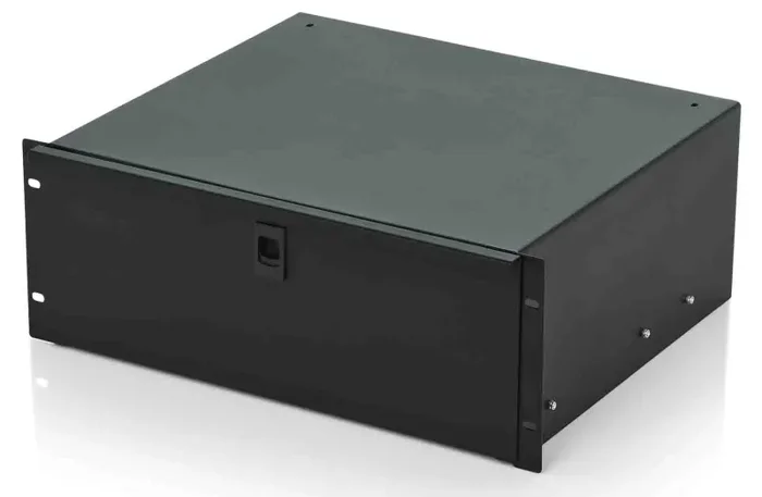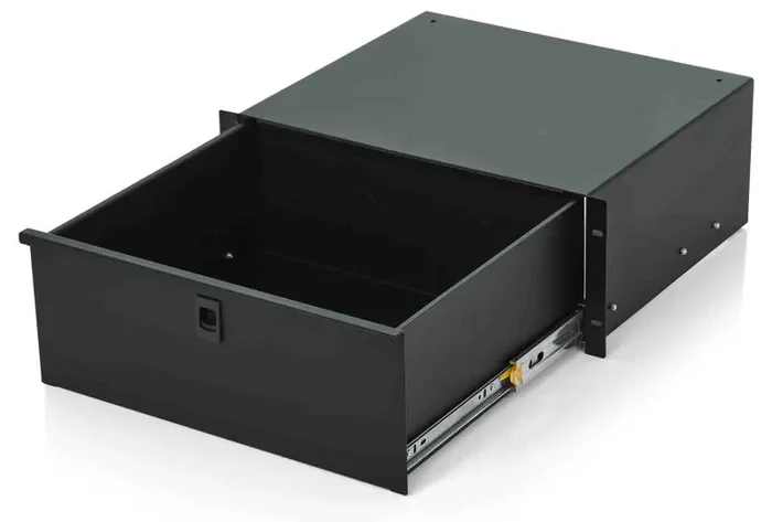 The Gator Case GRW-DRW4 is a Cold Rolled 16 Gauge Steel Construction. Fully Enclosed Drawer and Spring-Loaded Latches. Black Powder Coated Finish. Heavy-Duty Smooth Glide Drawer Slides. Lock knock-out, lock and key included. Two 2″ rubber grommets for rear access.
