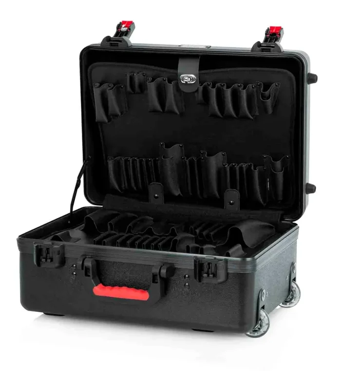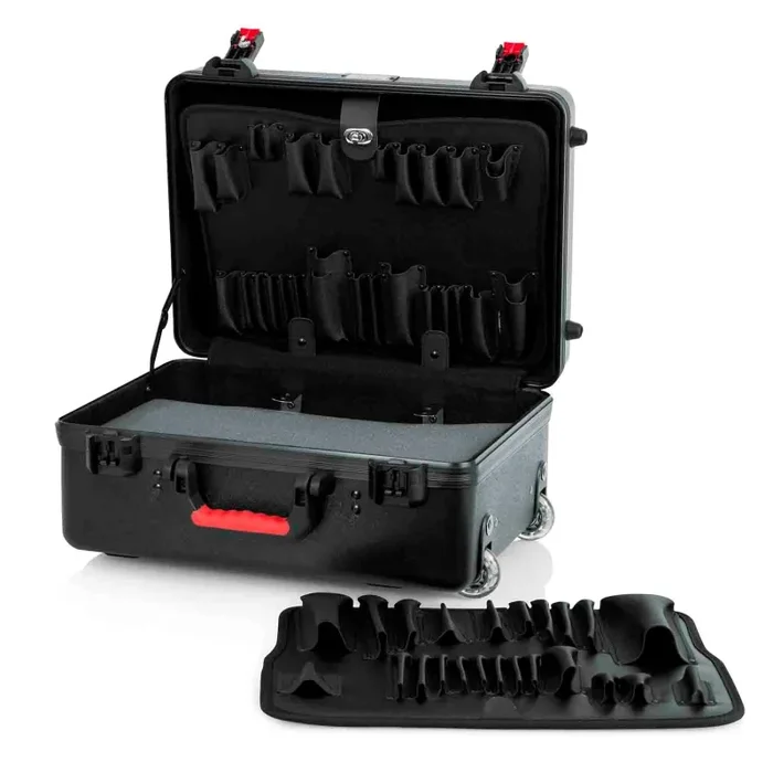 The Gator Cases GTSA-UTLPLT1813 is Utility Transport Case with 2 Removable Standard Tool Pallets. Nearly Indestructible Polyethylene Construction. Bottom Filled with 4″ Layered Foam. TSA Accepted Locking Latch Ideal for Air Travel. Ergo-grip Injection Molded Handle. Surface Mounted Impact Diversion Latch Housing and Red Release Trigger. Black Powder Coated Hardware and Continuous Valance. Retractable pull-out handle and Recessed Wheels.