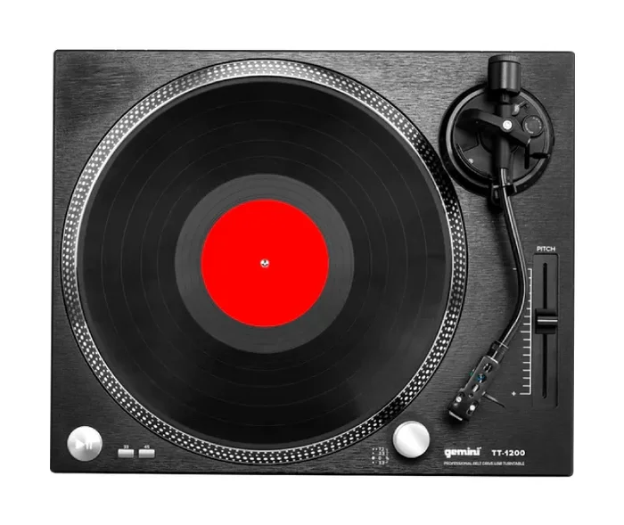 The Gemini Sound TT-1200 Belt Drive Turntable with Usb Interface features a redesigned chassis with reinforced housing construction. The TT-1200 uses a precision-engineered, die-cast aluminum platter for stable rotation. It’s ideal for DJs, audiophiles, and casual listeners alike. The TT-1200 has precision pitch control +/- 10%. The belt-drive motor offers 33, 45, and 78 RPM speed options. A statically balanced S-shaped tonearm features a hydraulic lift and an anti-skate mechanism. Gemini HDCN-15 Head shell/cartridge with Audio Technica elliptical stylus included. What sets this record player apart from most is its high-resolution USB connection, which enables you to record and digitize your vinyl collection with ease. Built-in Phono Preamp with switchable RCA phono/line output.