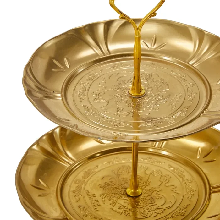 Details: Two-tier gold serving tray with floral detailing and ornate handle