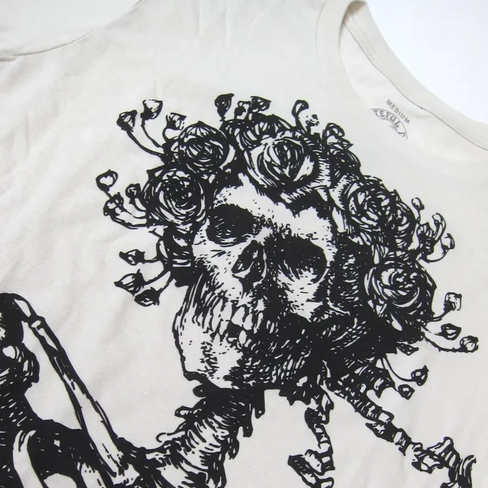 Official Grateful Dead logo tee featuring an oversize print of rose-adorned Bertha skeleton! All cotton, standard fit.