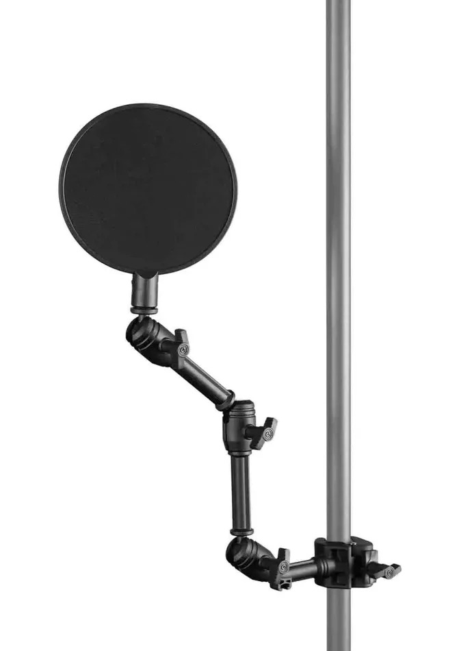 The Gravity GR-GMA3DAPOP1 is a Traveler 3D Arm with Pop Filter. Every bit of weight counts when you’re traveling by plane or truck from one gig to the next. After all, you can’t always rely on the concert venue having the right tool available for you when needed. The Pop Filter with 3D Arm MA 3D A POP 1 can be taken everywhere you go. It’s so light and space-saving, there’s absolutely no need for you to worry about weight or storage space. With this tool, you can enhance your voice- and vocal recordings by placing the high-quality pop filter, with double nylon mesh and a large screen diameter of 15.7 cm between you and your microphone. This way you avoid unwanted pop noises and clipping. Its fastening mechanism is quick and easy to assemble. The large clamping range from 15 to 35 mm lets you mount it on all popular microphone stands, and the three joints’ 360° rotation options allow you to install it as you like. Simply loosen, adjust, and tighten the wing screws. Voila – you’re all done! Once set, the MA 3D A POP 1 stays locked in place.