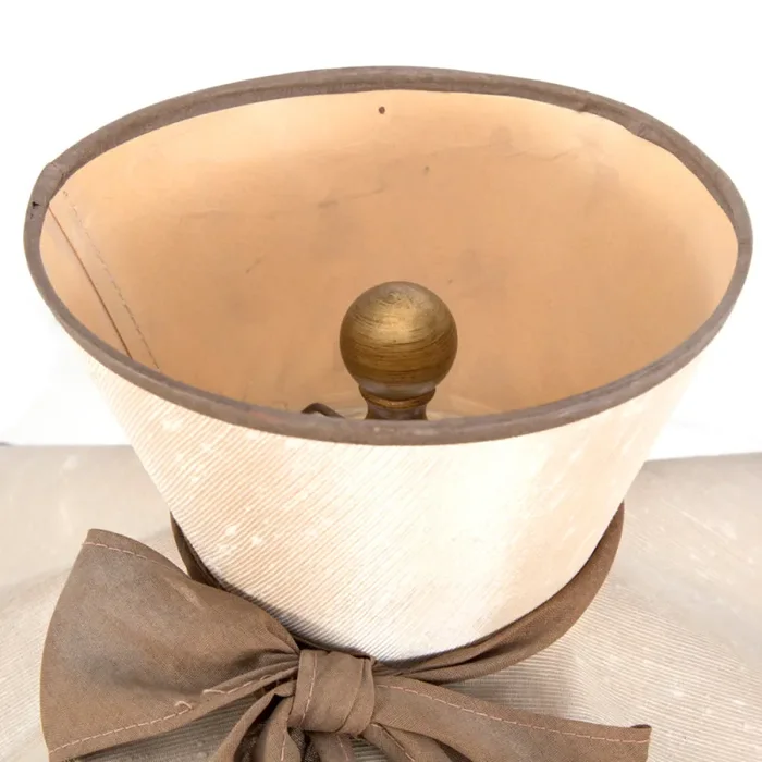 Details: Wood base lamp with wavy green glass and a brown bow shade
