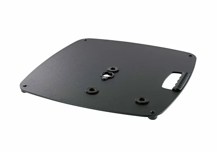 The K&M 26706 Heavy-Duty Steel Base Plate is a versatile and stable platform designed for distance rods and tubes. It features three M20 threaded options in centric, eccentric, and corner positions, allowing for flexible load distribution. The thin yet heavy-duty steel construction ensures reliable stability, while the integrated handle provides easy transportation and cable management. With a maximum load capacity of 77 lbs, this base plate is ideal for professional speaker setups, lighting stands, and various stage applications. Available in Black and White finishes.