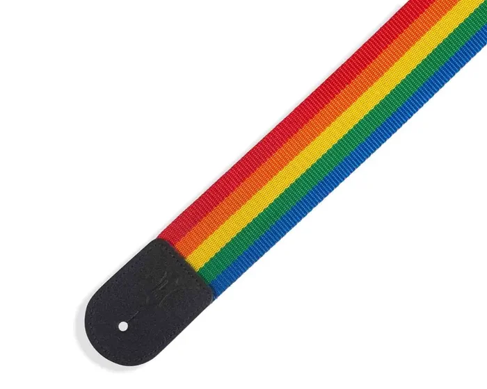 The Levy’s M8POLY-RNB 2″ Wide Rainbow Polyester Seatbelt Guitar Straps with One-Ply Top Grain Leather Ends. Plastic Slide and Loop Adjust From 35″ to 60″.