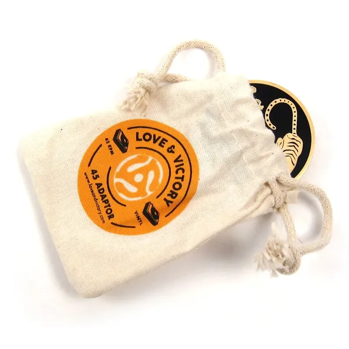 “Flair for your vinyl. Slide one of our weighted 45 rpm adaptors onto the spindle of your turntable to play your favorite 7”. The heavy duty enameled metal disc comes packaged in our custom muslin pouch, perfect for toting along to a party or your next spin session.” – Love And Victory
